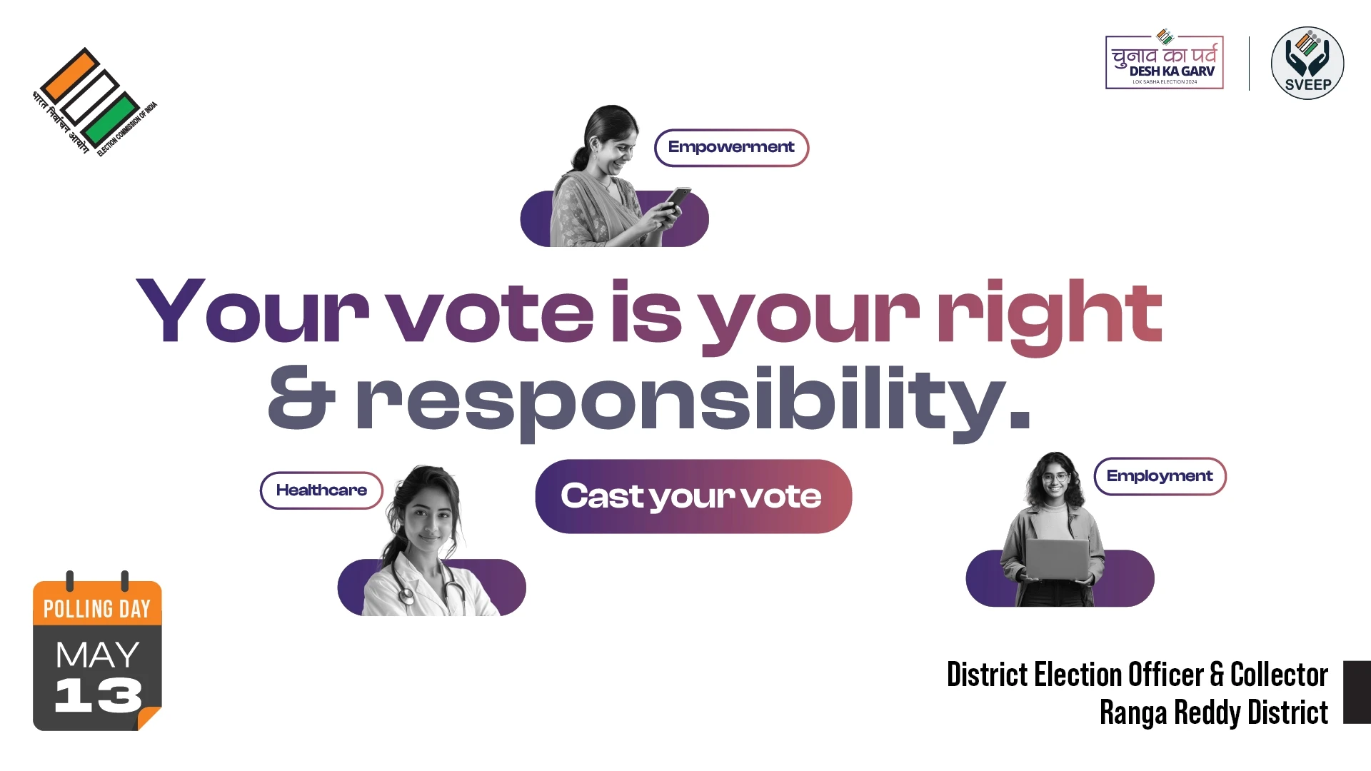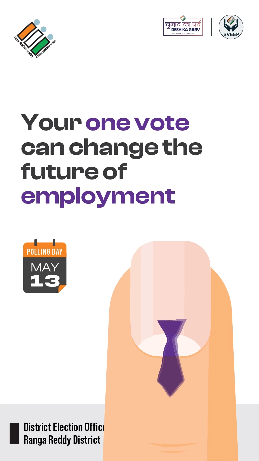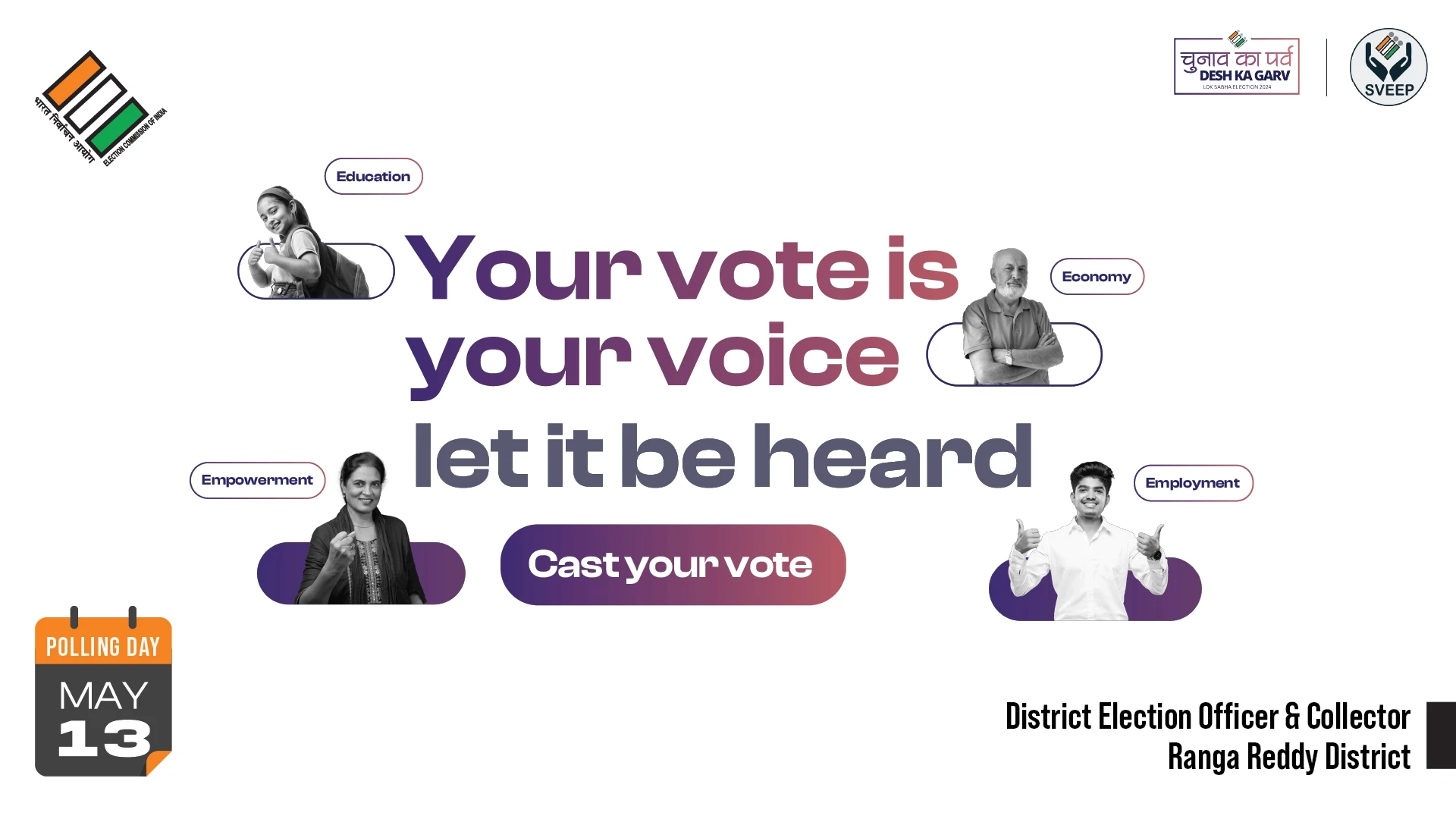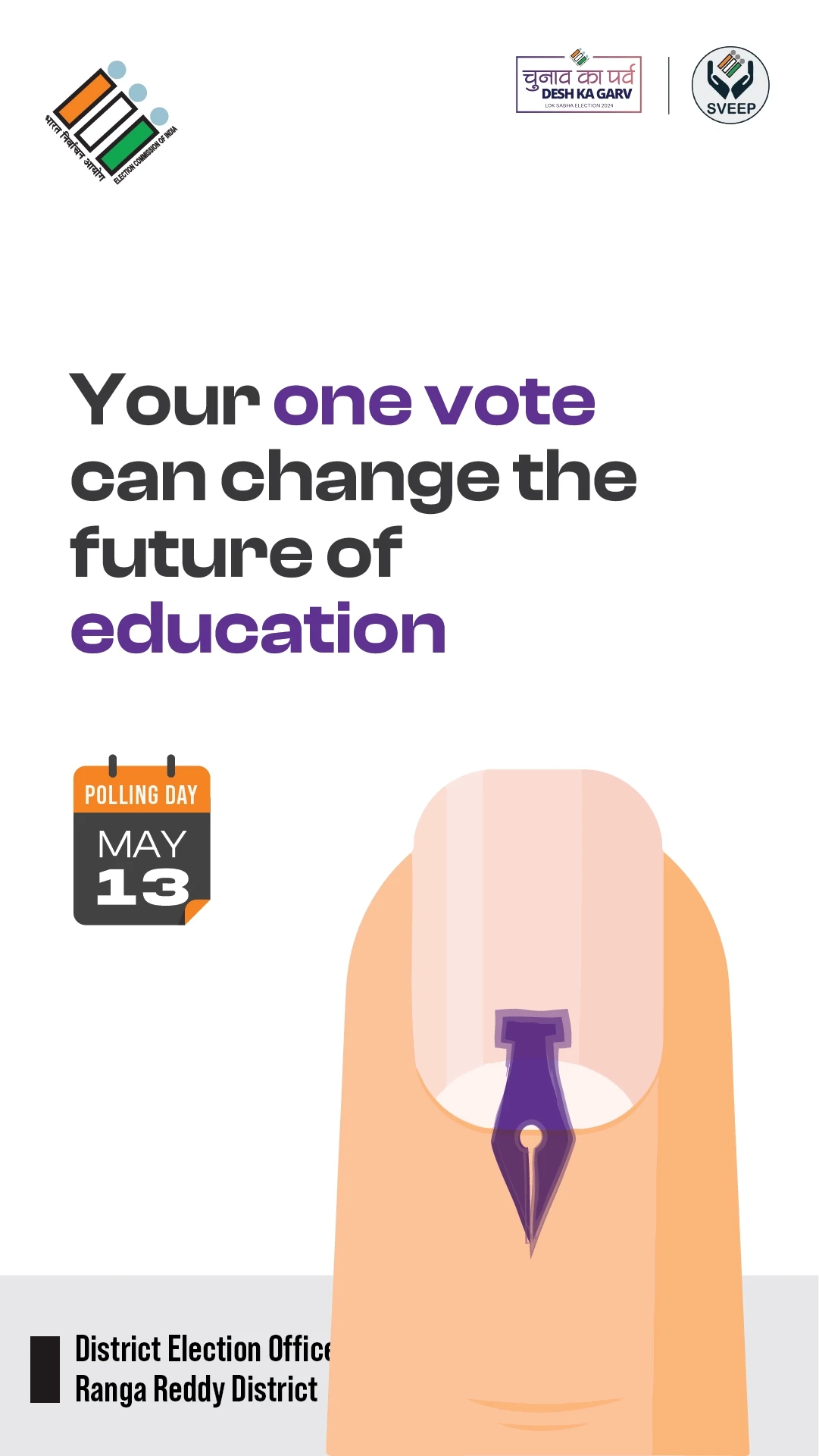 the election commission of india (eci) entrusted us with the crucial task of designing campaigns and stickers to promote voter awareness among urban voters. collaborating with the district election officer & collector of ranga reddy district, we embarked on a mission to encourage every eligible citizen to exercise their right to vote.