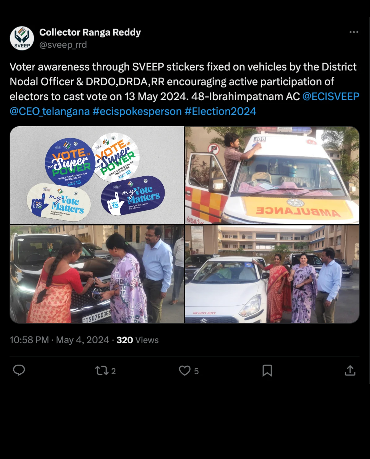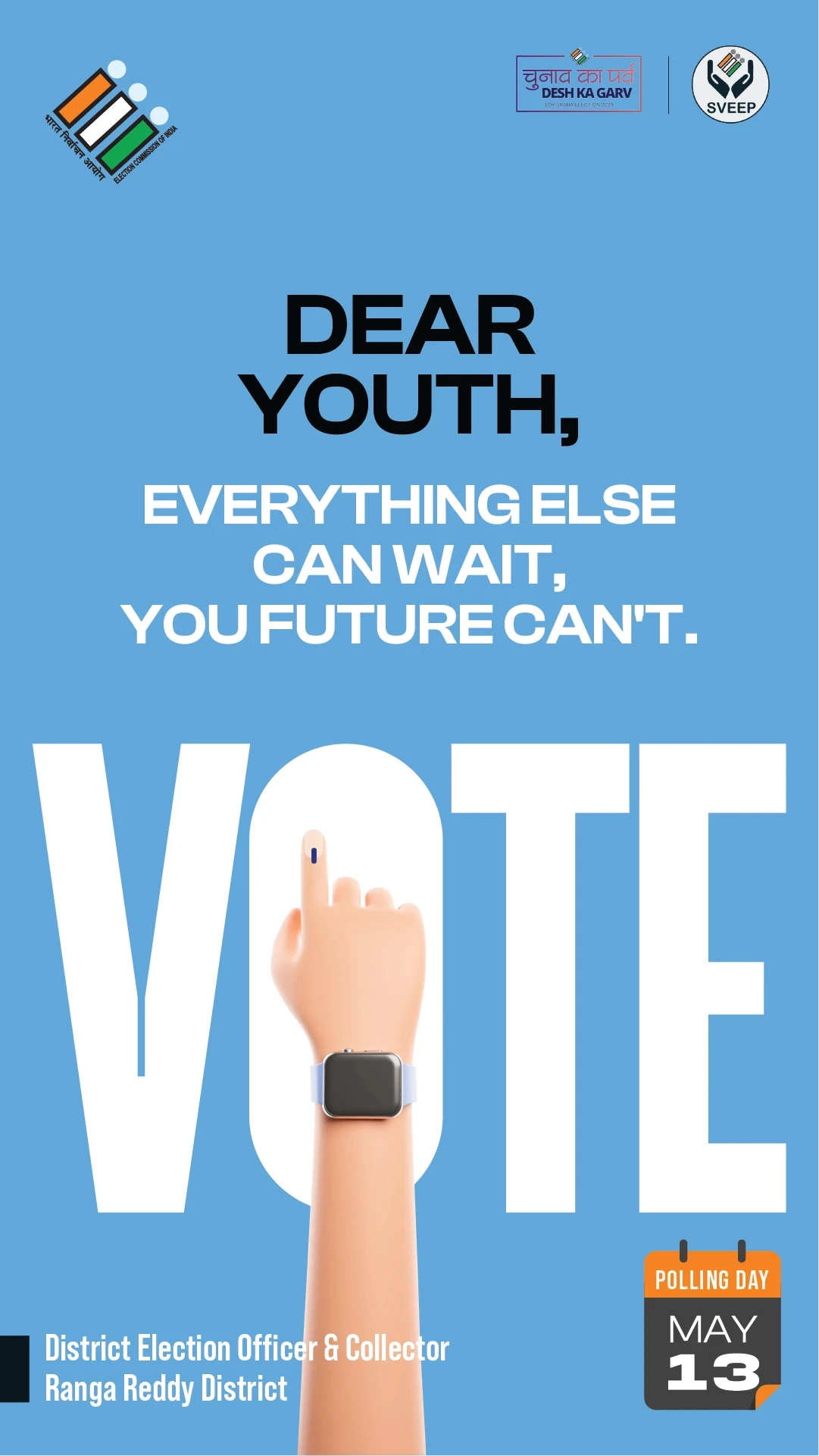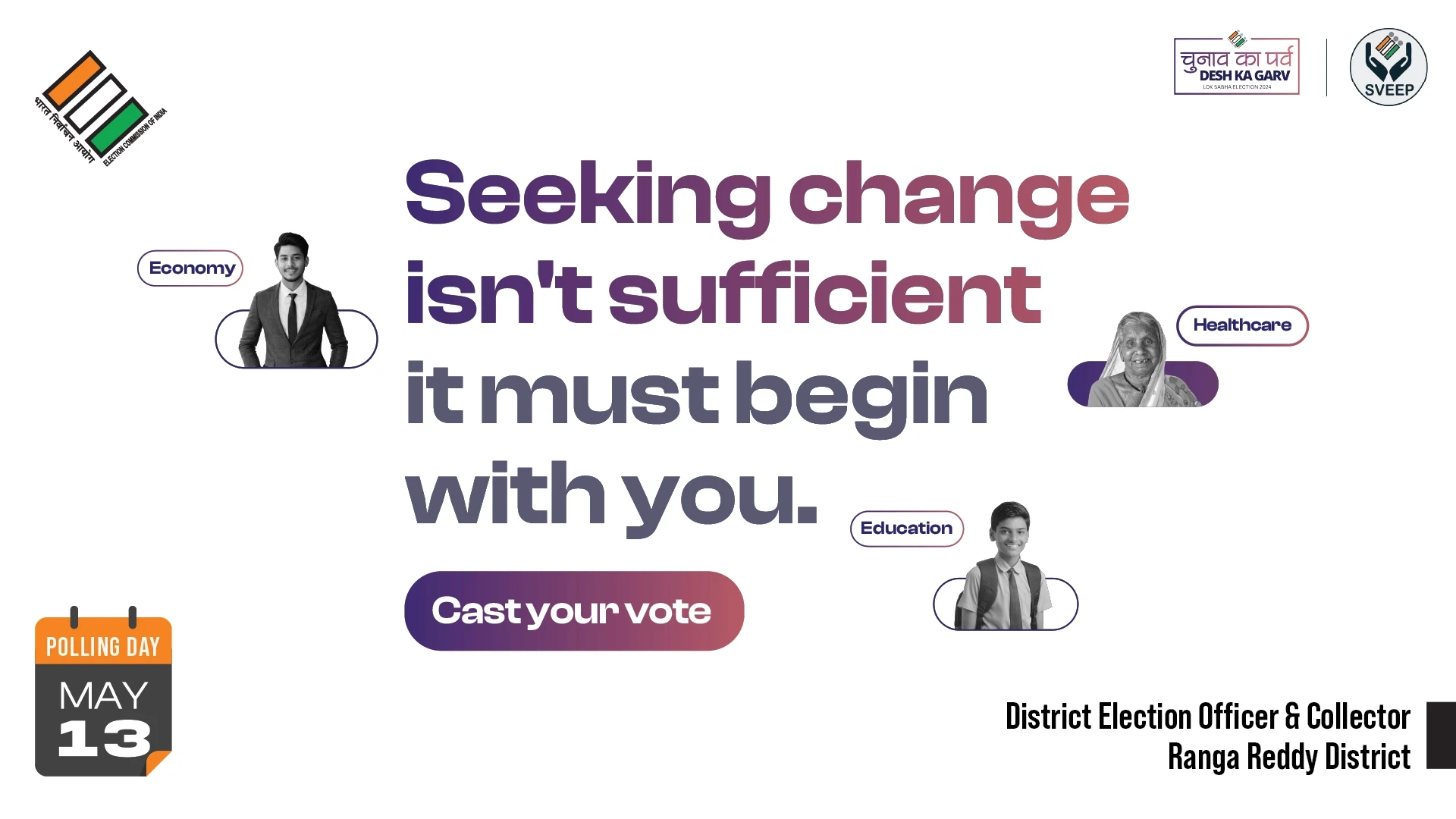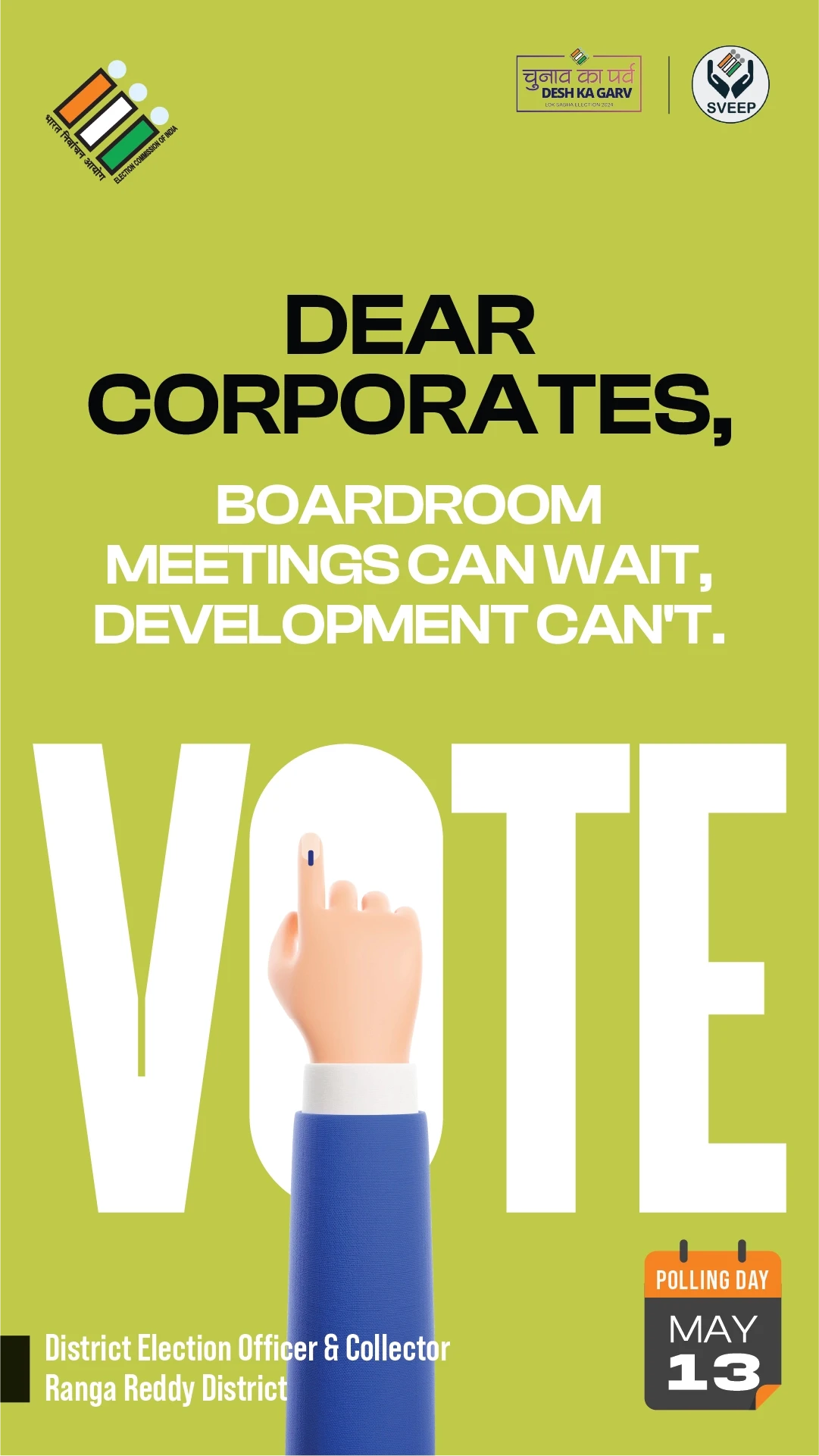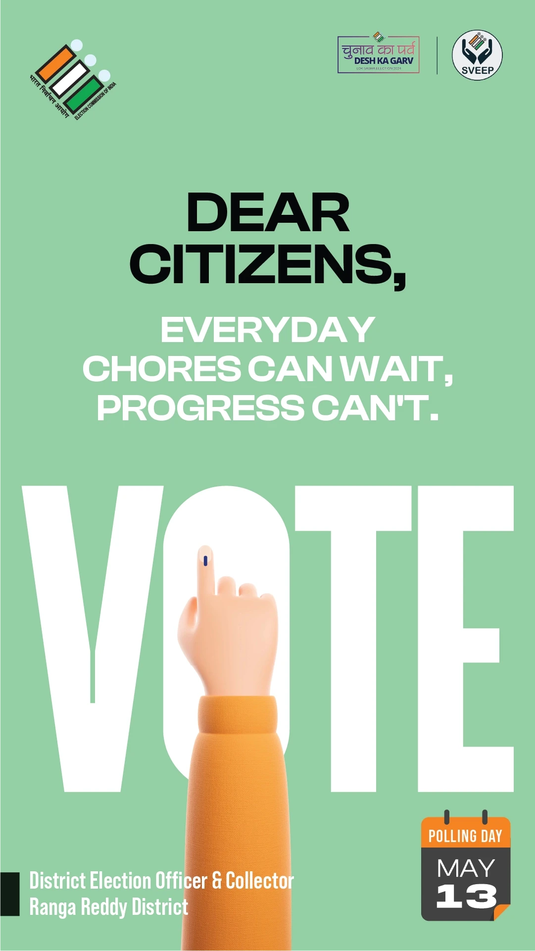 the election commission of india (eci) entrusted us with the crucial task of designing campaigns and stickers to promote voter awareness among urban voters. collaborating with the district election officer & collector of ranga reddy district, we embarked on a mission to encourage every eligible citizen to exercise their right to vote.